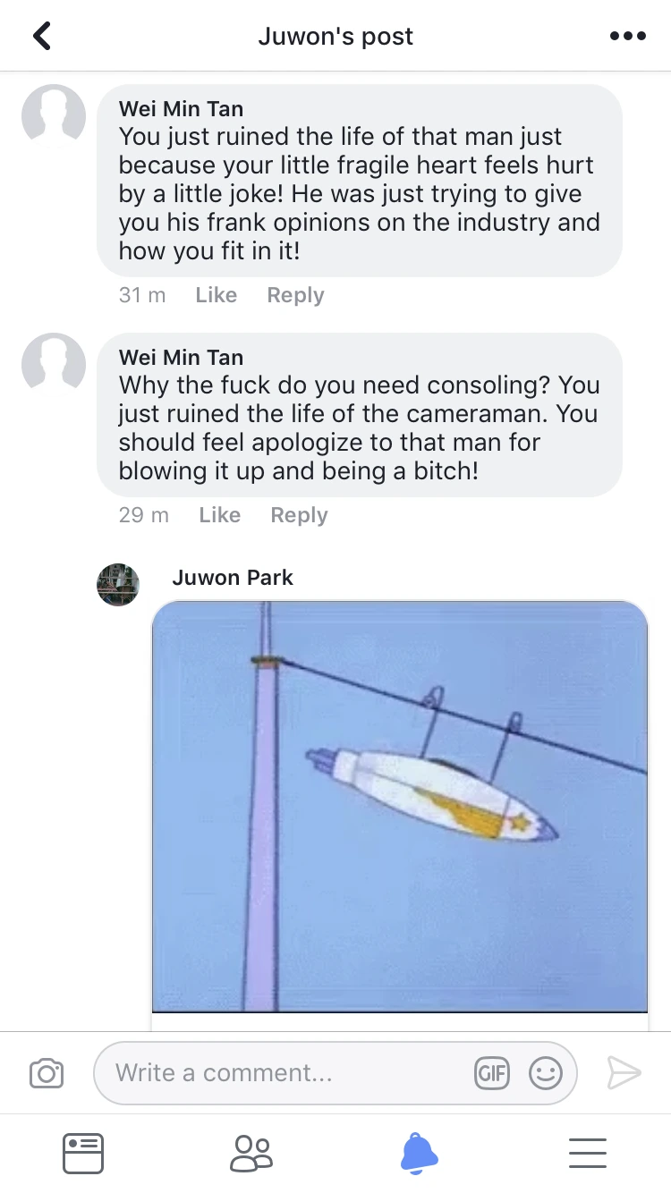 몇 여성 피디들이 나를 “꽃뱀”이라고 부르고 “한 남자의 인생을 망쳤다”며 수군댄다는 소식을 전해 들었다. 그중 몇 명은 인권 관련 프로그램 제작 담당이었다.