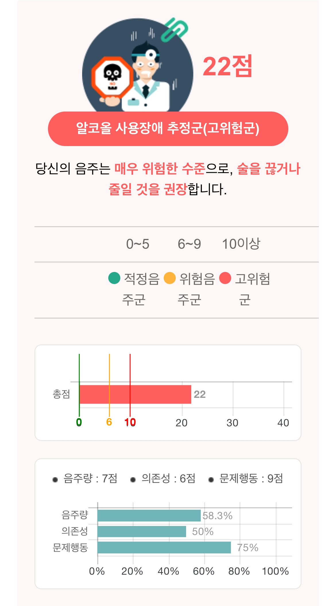 40점 만점(?)에 22점이니, 이 정도는 나쁘지 않네 하다가 5점 이상부터 음주 문제가 있을 수 있다는 부분을 읽으니 살짝 ‘경각심’이 들었다.