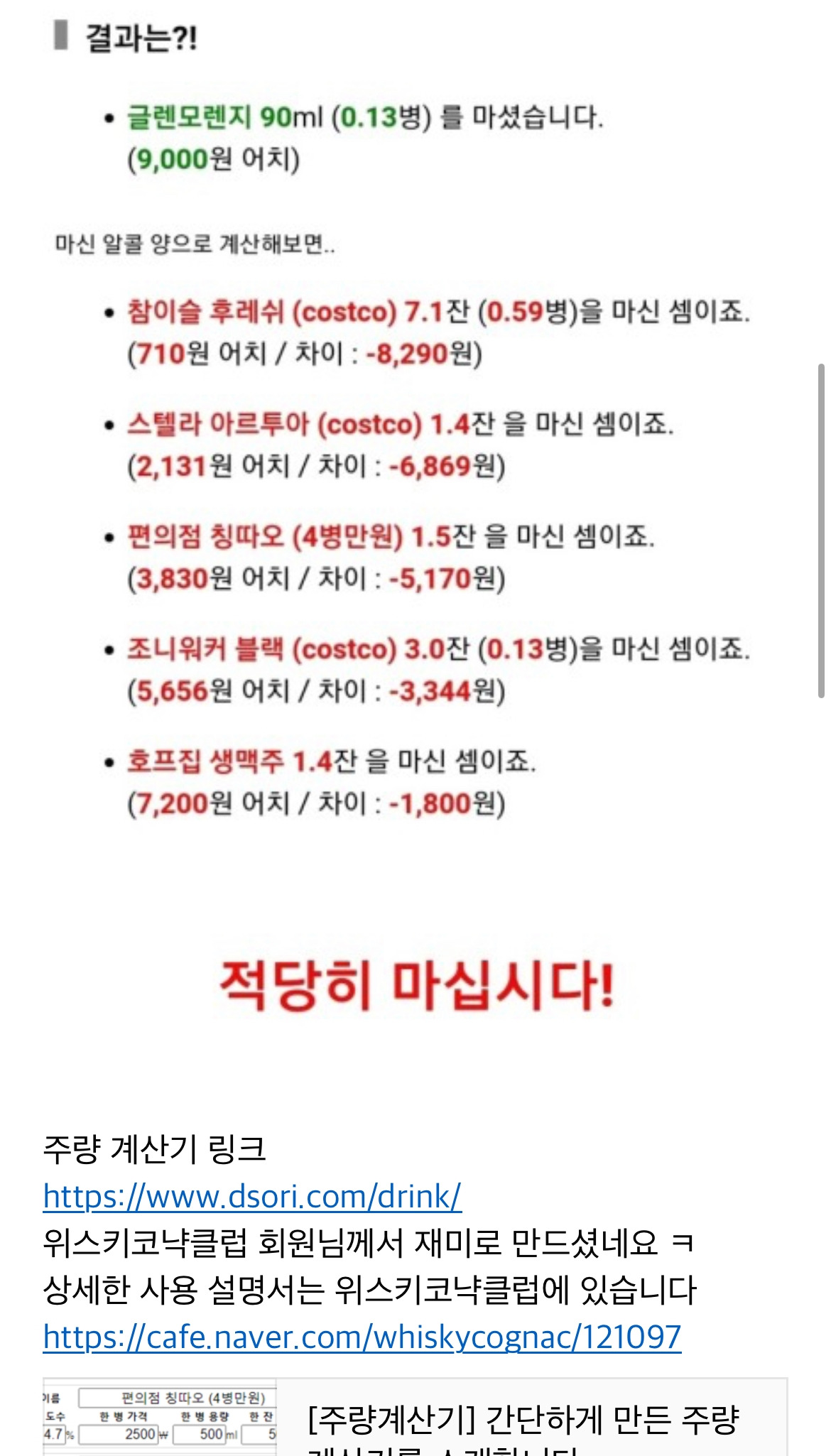 보통 한 번에 위스키를 니트로 (얼음 없이) 세잔 정도 마시는데, 저 주량 계산기에 따르면 위스키 세잔이 소주 7잔, 약 0.6병 정도라고 한다 (생각보다 심하지 않아서 안도했다).