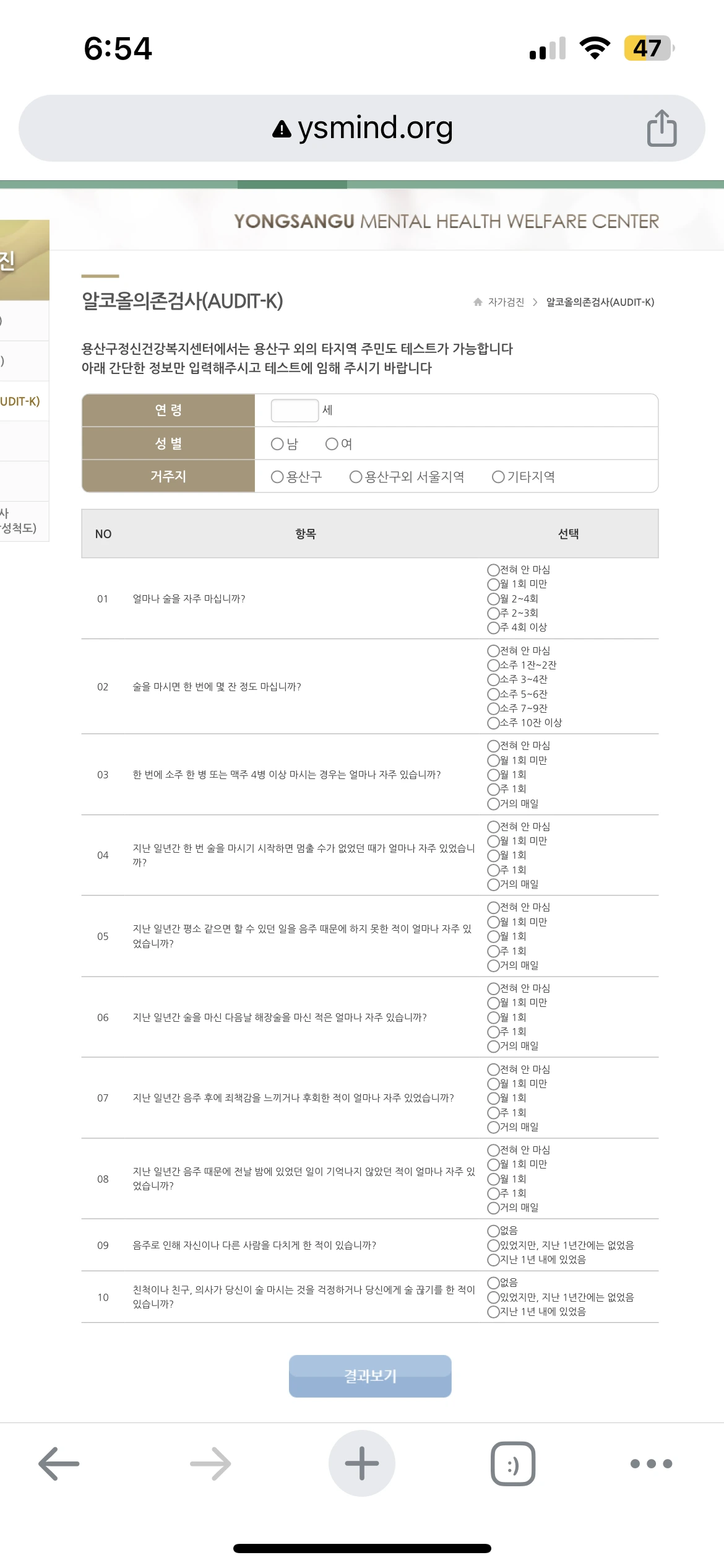 병원에서 돌아온 후, 싱숭생숭한 마음으로 ‘알코올 중독’을 네이버에 쳐보니 알코올 의존 검사가 눈에 들어왔다.