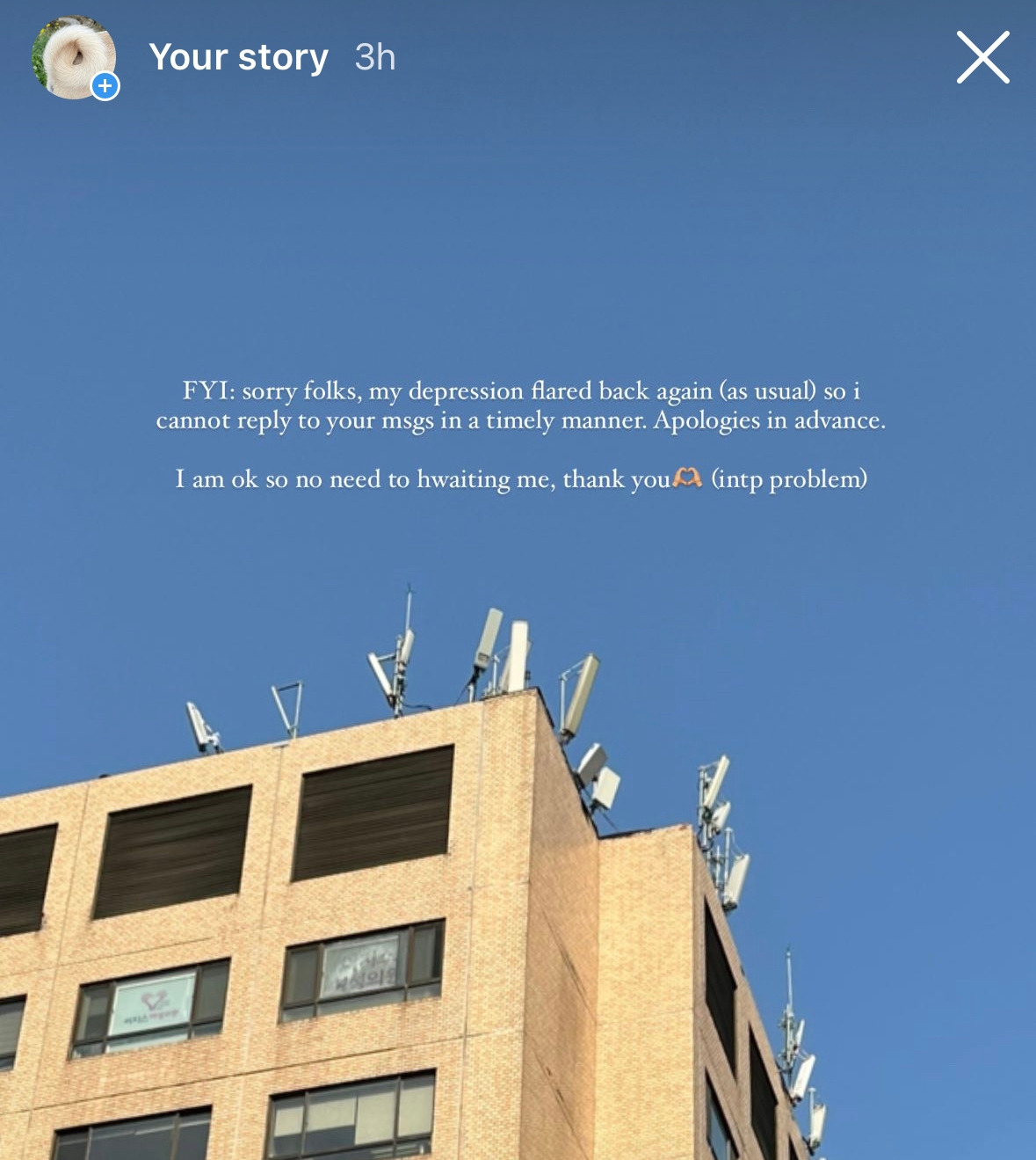 그 후, 나는 인스타그램에 맑은 하늘 사진을 찍고, 우울증이 도져서(?) 밀린 메시지에 답을 바로 못 한다고 양해를 구했다.