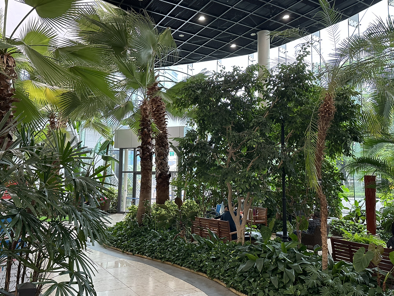 본관 A 입구 옆으로 가면 트로피컬 숲 같은 환경을 벤치와 조성해 놨는데 나중에 알고 보니 진짜 열대 나무들이었다.