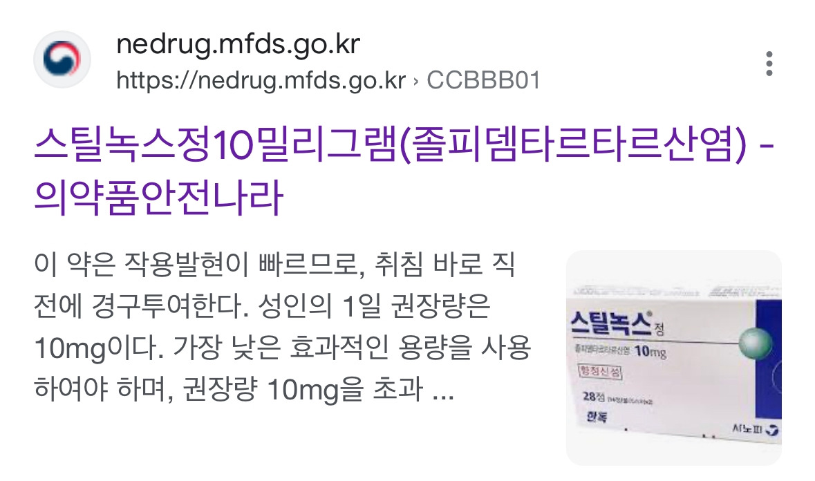 어느 순간, 내 수면유도제에는 졸피뎀이 추가되었다. 졸피뎀인줄 몰랐는데 내과 진료를 받으면서 현재 복용중인 정신과 약을 보여줬더니 내과 의사 선생님이 졸피뎀이 있다고 말씀해 주셔서 알게 되었다 (기본적으로 정신과에서 약은 대충이라도 설명해줘야 하지 않나…)