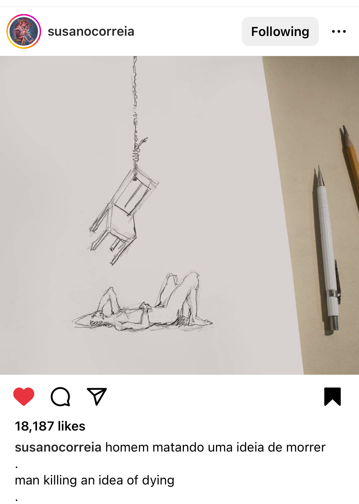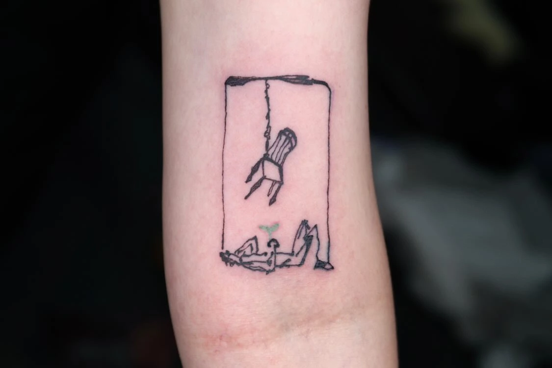 목을 맬 때 쓰는 의자를 오히려 매달아 버리면서 죽음에 대한 생각을 죽인다는 내용의 그림이다. 오랫동안 이 그림을 보면서 위안을 얻었기 때문에 타투를 해도 절대 후회할 것 같지 않았다.