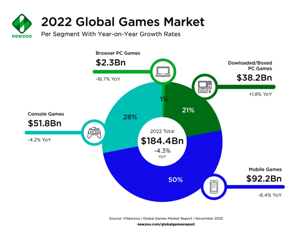 게임 시장의 판도는 시장 규모로 쉽게 파악할 수 있습니다. 2022년 전세계 게임 시장 규모를 보면 모바일 게임 시장이 50%를 점유하고 있습니다. 모바일 게임 시장이 게임 시장의 판도를 바꾸면서 과거 웹에서만 구동되던 여러 게임들 (리니지, 메이플스토리 등)도 이제 모바일에서 플레이할 수 있습니다 (개굴).