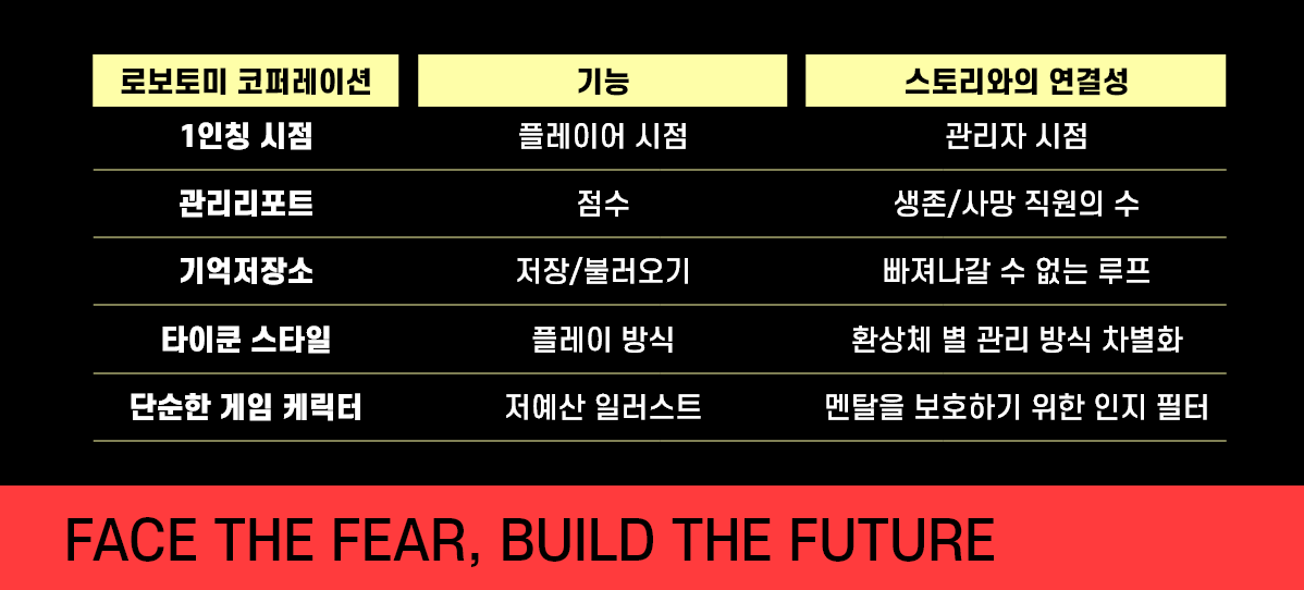 정리하면 다음과 같습니다. 각각의 요소가 게임 플레이 만을 위한 요소가 아니라 스토리와도 연결되어 게임의 몰입감을 더하는 것이죠.