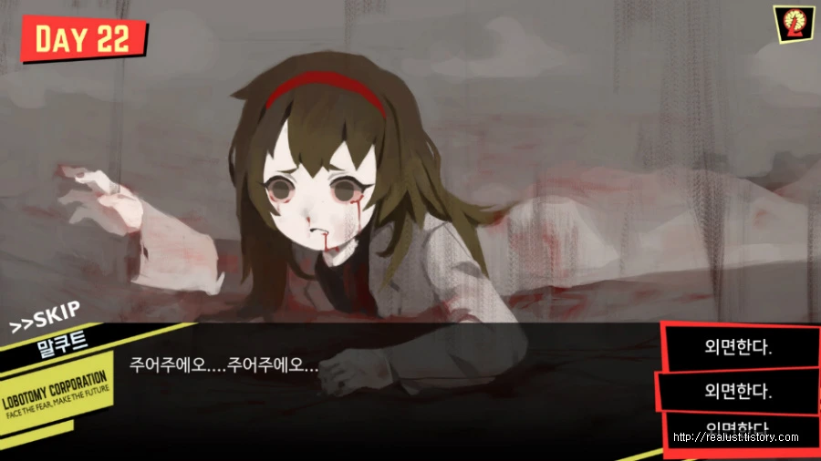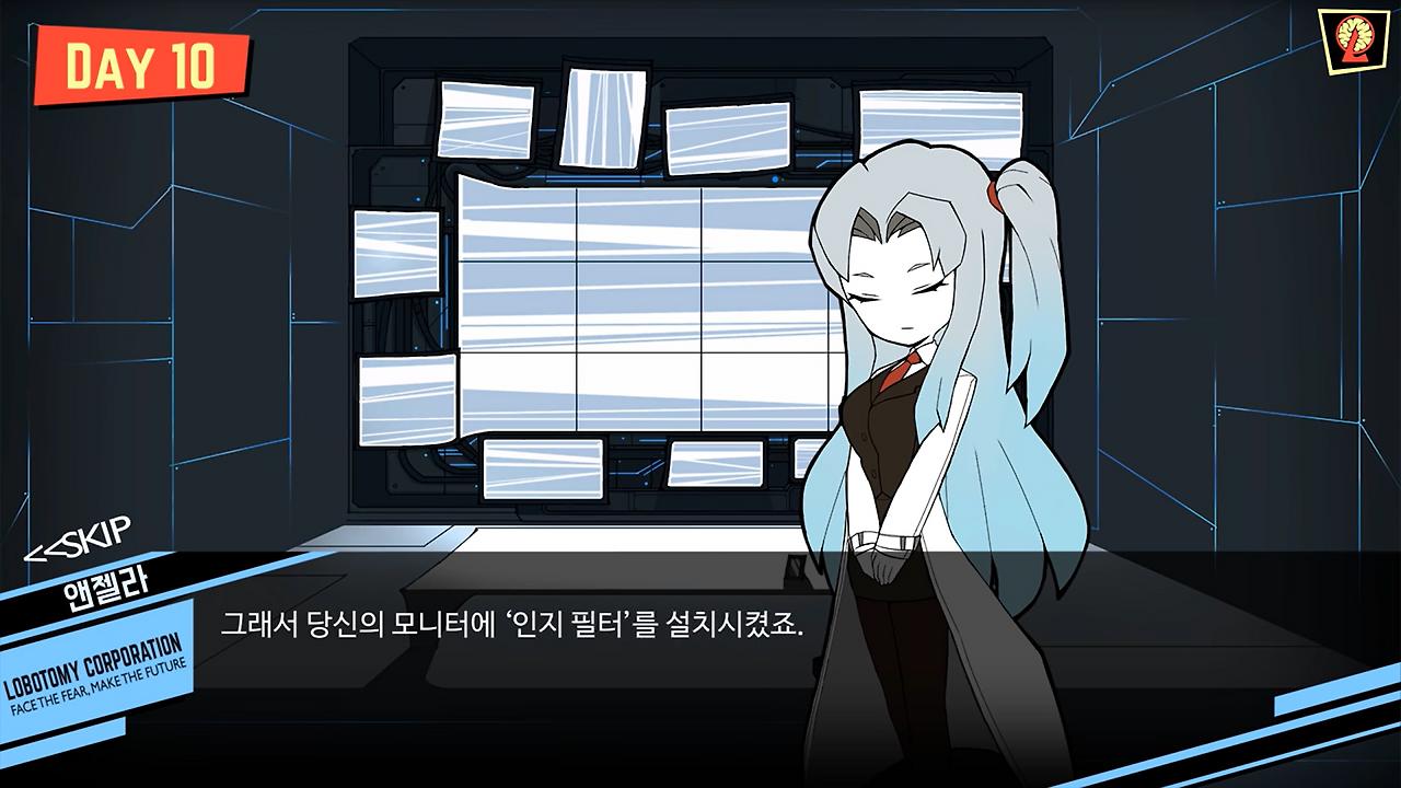 제가 보고 있는 모니터의 화면이 인지 필터를 씌운 귀여운 모습이라고 합니다. 실제로 로보토미 코퍼레이션의 여러 잔인한 장면은 다소 귀여운 캐릭터들로 그려져 ‘잔인하게 느껴지지’ 않습니다. 그러나 이를 확대시킬 때 보이는 직원들의 대사는 다소 섬뜩한 면이 있죠. 게임의 그림조차 관리자라는 설정과 디스토피안 세계관이라는 설정이 맞물려 만들어진 부분에서 이 게임의 섬세한 스토리 구성에 감탄하게 됩니다.