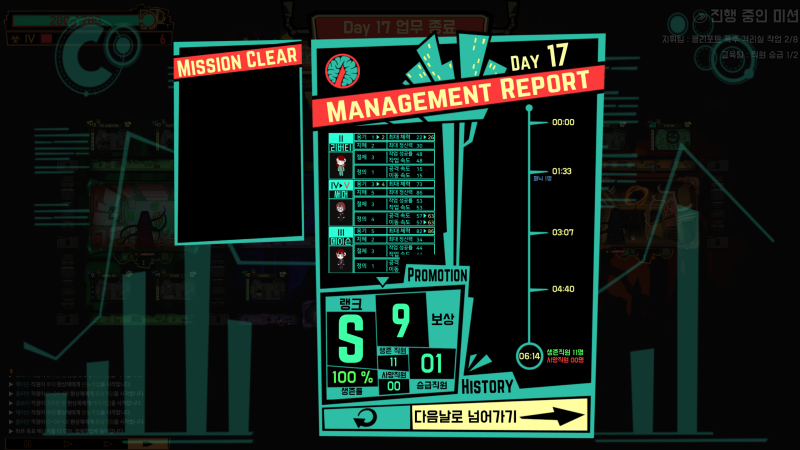 두 번째는 게임 리포트입니다. 이는 위 플레이어 시점과도 연결됩니다. 매 일 작업이 끝나면 관리 리포트 (Management Report)를 받게 됩니다. 게임 플레이를 고려했을 때 가장 중요한 것은 승급 직원 수겠죠. 하지만 아래 ‘생존 직원’과 ‘사망 직원’이 적혀있습니다. 환상체 특성 상 하루가 끝나면 직원이 죽는 경우도 있습니다. 본 리포트에서는 무슨 직원이 죽었는지조차 알 수 없습니다. 생존과 사망이라는 단어는 본 게임의 하루 하루가 생존의 연속임을 나타내고, 이름이 적혀있지 않는 사망자는 본 게임의 세계관을 다시 한 번 상기시켜주는 장치로 작용합니다. 성과도 축하도 아닌 Management Report는 직원이 하나의 숫자임을 차갑게 보여줍니다.