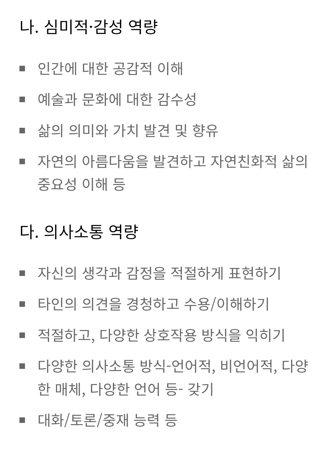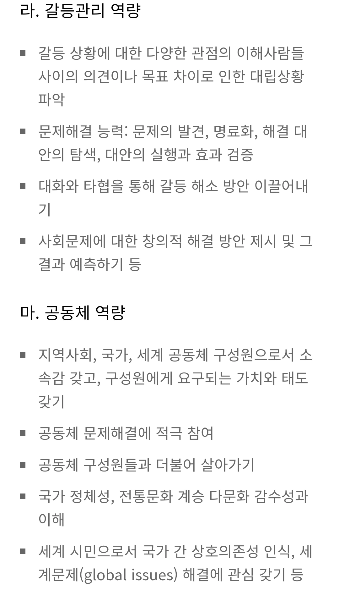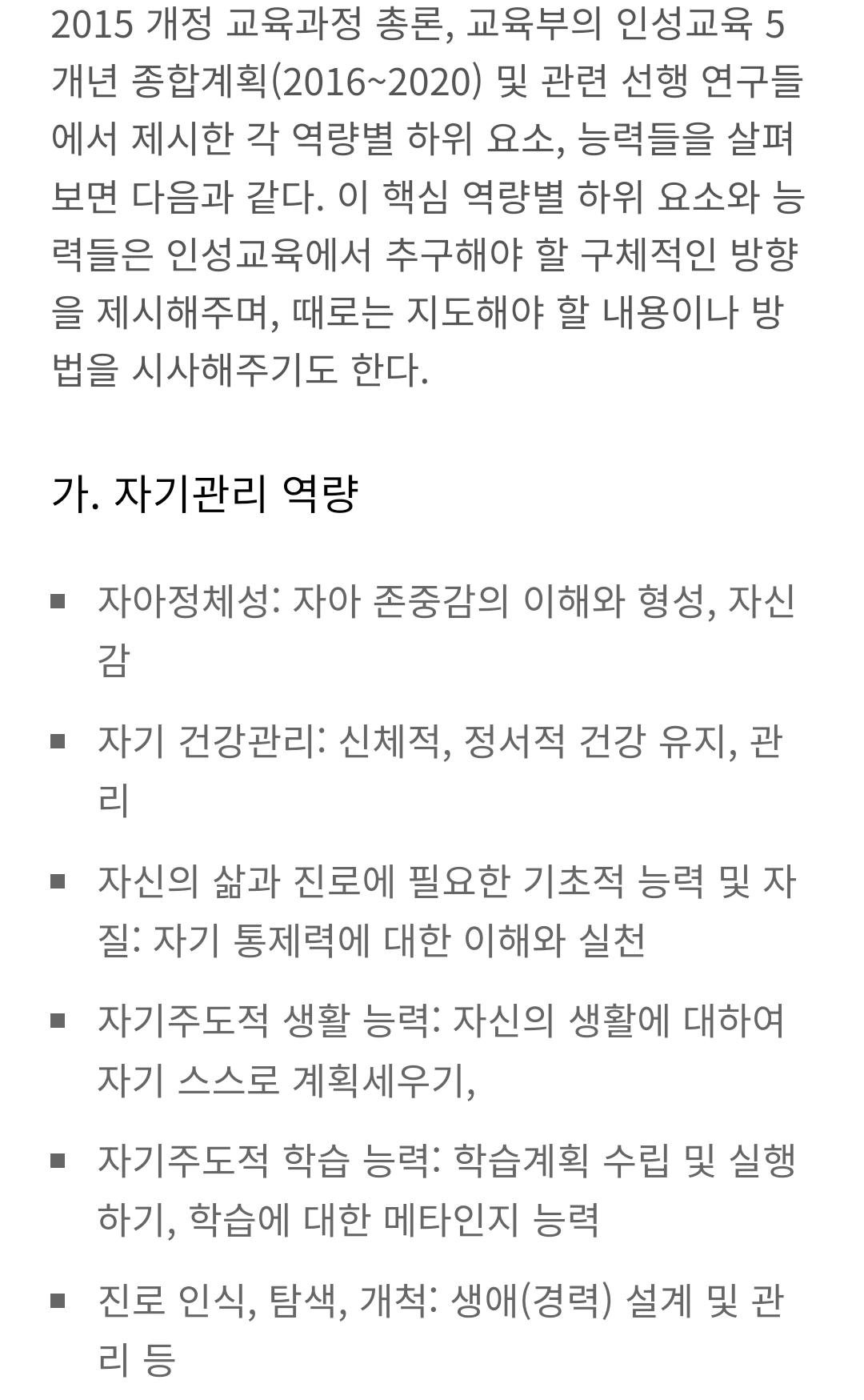 대한민국 교육부가 인성교육 종합계획에 제시한 역량. 이러니저러니 해도 교육부가 국가 최고 지성이긴 한 듯. 세부 덕목이 아닌 역량이라고 표현해서, 보다 교육적이고 실천적이다.
