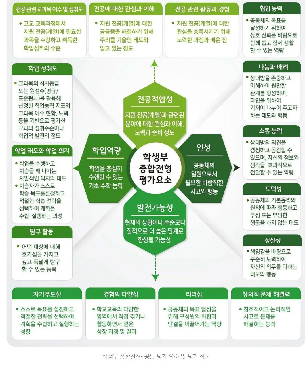 대한민국 입시에서 중시하는 인성 요소(오른쪽 짙은 녹색). 아무래도 여러 덕목들 가운데 수학능력에 좀더 치중한 듯.