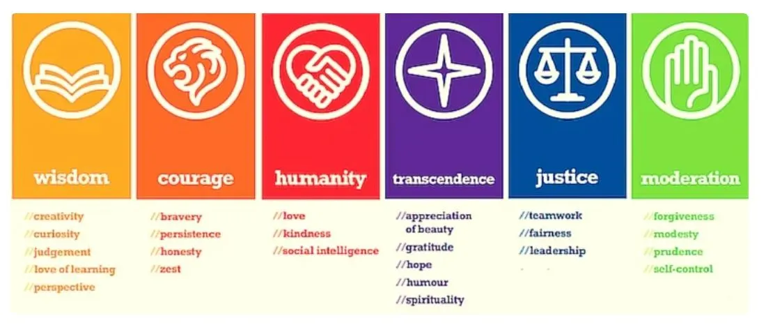 긍정 심리학자 마틴 셀리그먼의 6개 카테고리 24가지 성품 덕목. 상당히 내 취향! 앞에 세 개는 각각 레번클로, 그리핀도르, 후플푸프♥ 슬리데린은 없다네...=_=ㅋ