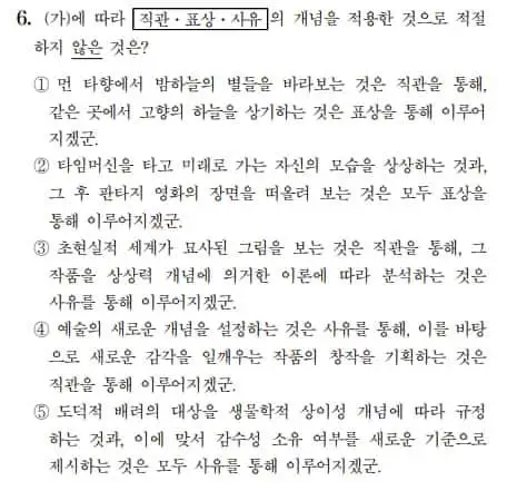 이 문항이 쉽다 어렵다, 나는 풀었다 못 풀었다 같은 너절한 소리는 하고 싶지 않다. (시간 제약이라는 부담 없이 자발적인 독자로서 지문을 읽는 제 입장을 어찌 수험생들의 입장과 비교할 수 있겠습니까. 사실은 6번 문제가 아니라 3점짜리 8번 문제가 제일 난해했죠. 푸는 데 시간이 정말 많이 걸리더군요. 대한민국 수험생들 정말로 모두모두 대단하고 기특합니다.)