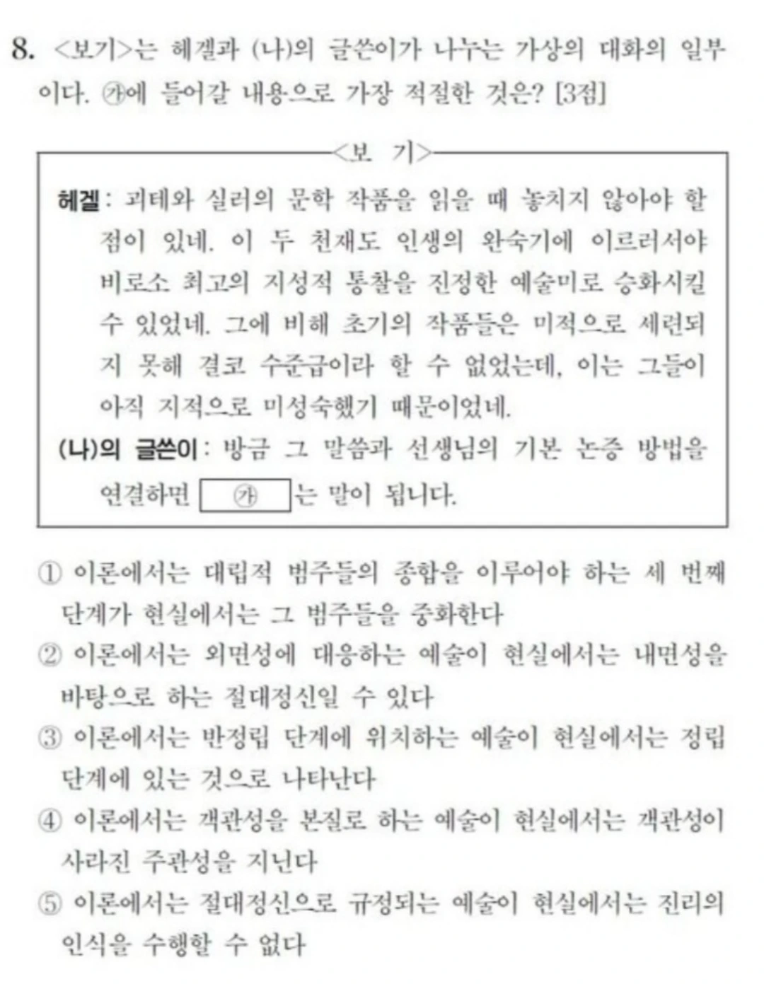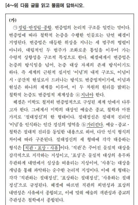 올해는 헤겔의 변증법에 대한 지문이 나왔다.