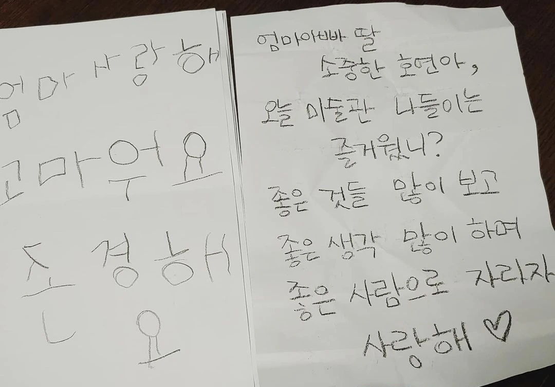 미술관 나들이 후 호연이의 편지, 엄마의 편지. '존경'이라는 말은 지난 5월 어버이날 행사에서 주워들은 것뿐. 존경의 뜻을 설명해 주었더니 엄마가 머리를 잘 묶어서 존경한단다.
