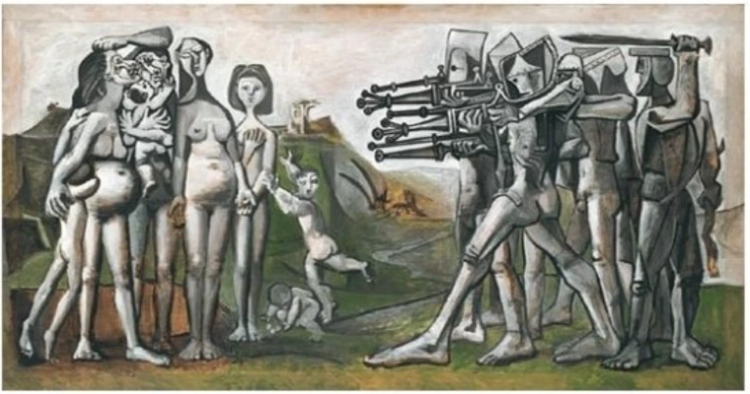 -피카소 아저씨는 오른쪽 사람들을 다른 나라 사람이라고 생각하고 그렸대. 다른 나라 사람들이 무기를 들고 와서 우리나라 사람들을 괴롭혔다고 말이야. 이런 일이 또 일어나면 안 되겠지?