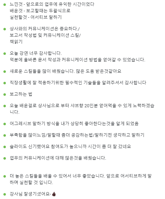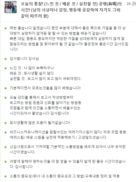 이번 과정은 신입사원들이 조직에서 가장 어려워하는 비즈니스 커뮤니케이션에 대해서 학습했다.