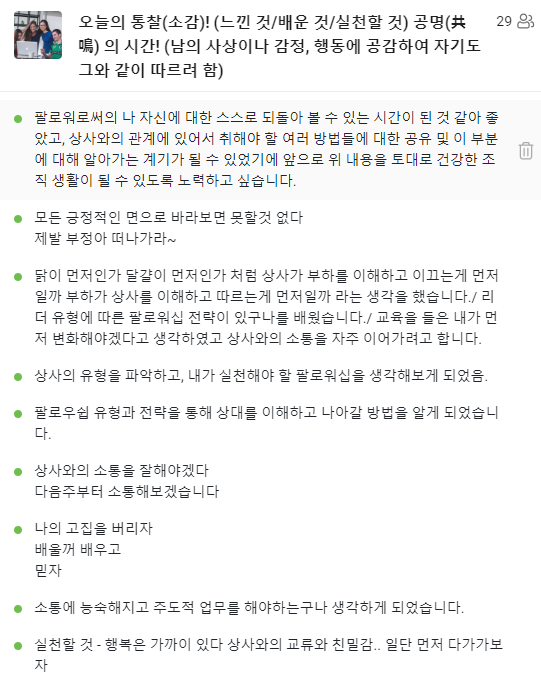 질문을 던지면 스스로 토의하고 성찰하는 과정이 계속 이어진다.