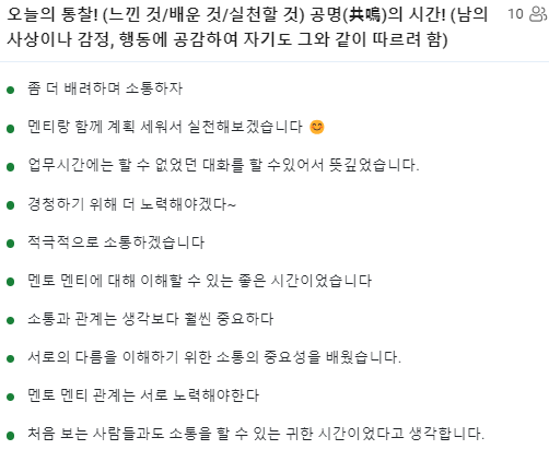 함께 의견을 나누면서 멘토링의 중요성을 깨닫고 즐거운 마음으로 서로를