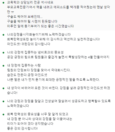 회복탄력성, 긍정마인드셋, 성장마인드셋 등을 통한 리더의 마인드세팅을 하는 시간을 가졌다.