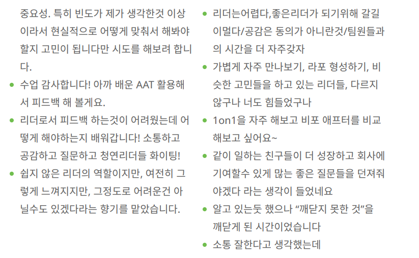 특히 한 임원께서 "오늘 배운 내용을 바로 내일부터 적용해보고 싶다"고 말씀해주셔서 정말 뿌듯했습니다.