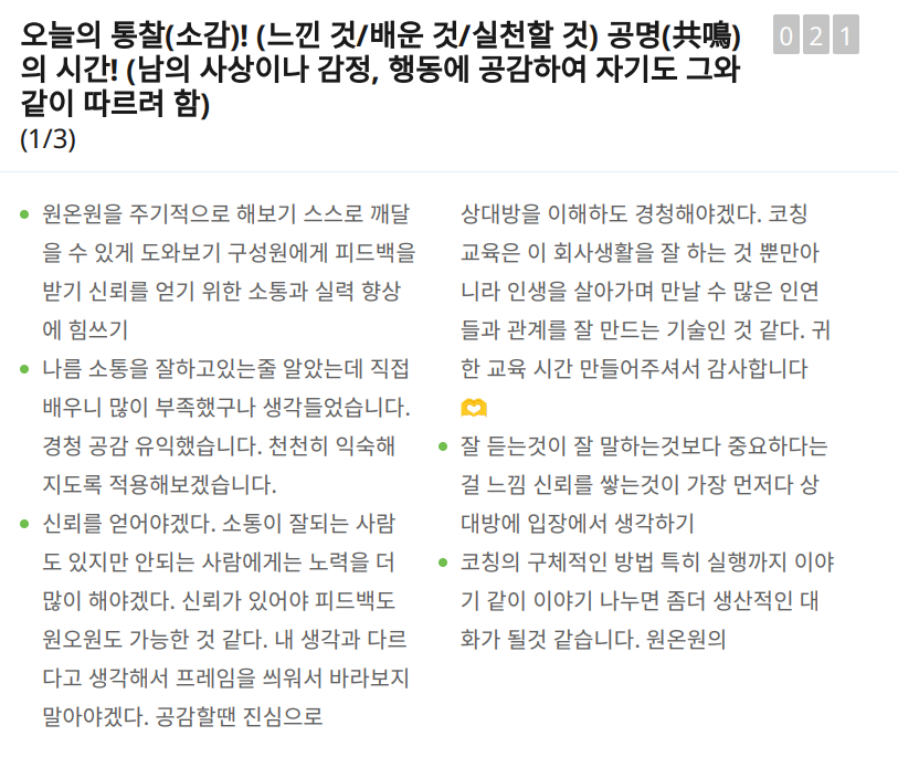 다양한 코칭 기법들을 소개했습니다. 특히 경청과 질문 스킬, 피드백 방법 등을 실습을 통해