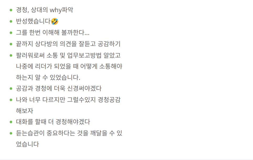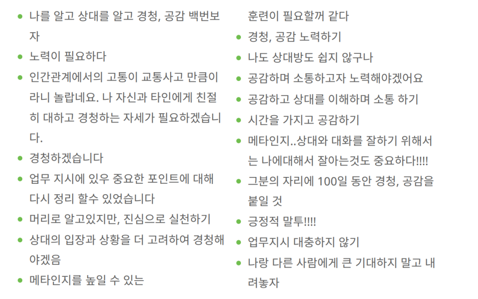 실습 결과를 토대로, 우리는 업무 상황에서 활용할 수 있는 구체적인 커뮤니케이션 기법들을 살펴봤습니다.