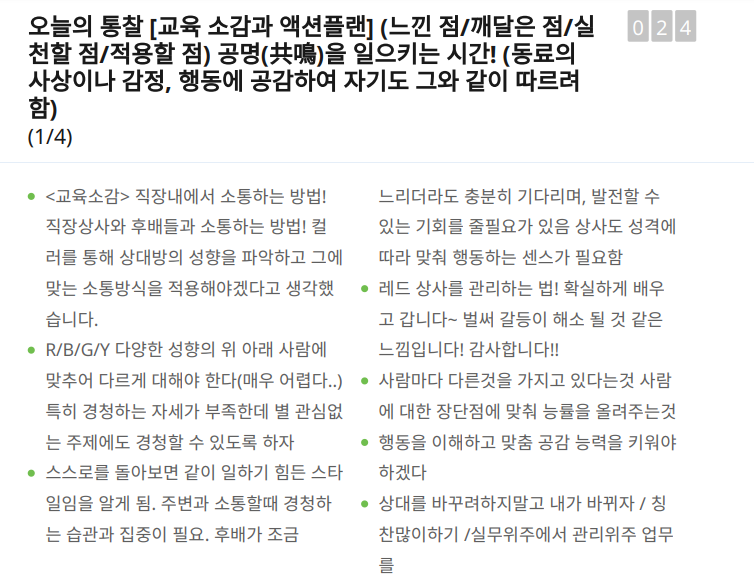 또한, 중간관리자의 '브릿지 리더십'에 대해 설명해주셨는데요. 상사와 부하 직원 사이에서 다리 역할을 하는 것이 얼마나 중요한지, 그리고 어떻게 해야 하는지 상세히 알려주셨어요. "여러분은 조직의 비전을 아래로 전달하고, 현장의 목소리를 위로 전달하는 핵심 역할을 합니다. 이 역할을 잘 해내는 것이 곧 조직의 성공으로 이어집니다."라는 말씀에 참가자들 모두 고개를 끄덕이더라고요