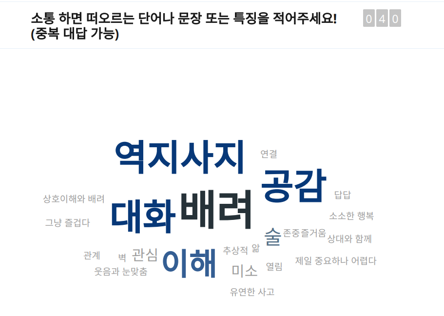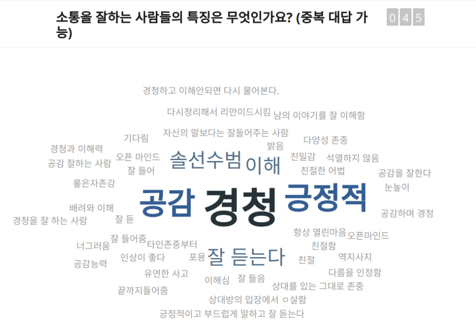 소통을 잘하는 리더와 그렇지 못한 리더의 특징을 비교해보는 시간도 가졌습니다. 이 과정에서 참석자들의 활발한 의견 교환이 있었고, 슬라이도 플랫폼을 활용해 실시간으로 의견을 취합하고 공유했습니다. 이 쌍방향 소통 방식이 교육의 몰입도를 크게 높였다는 평가를 받아 매우 기뻤습니다.