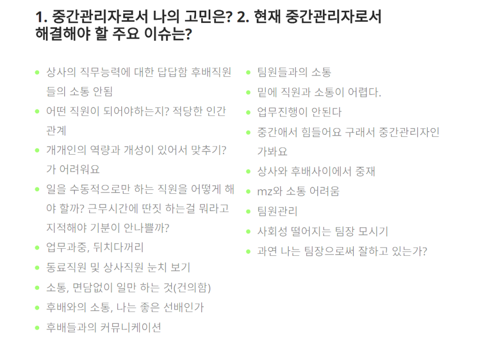 먼저 중간관리자의 역할에 대해 이야기를 나눴습니다. 중간관리자는 단순히 상사와 부하 직원 사이에