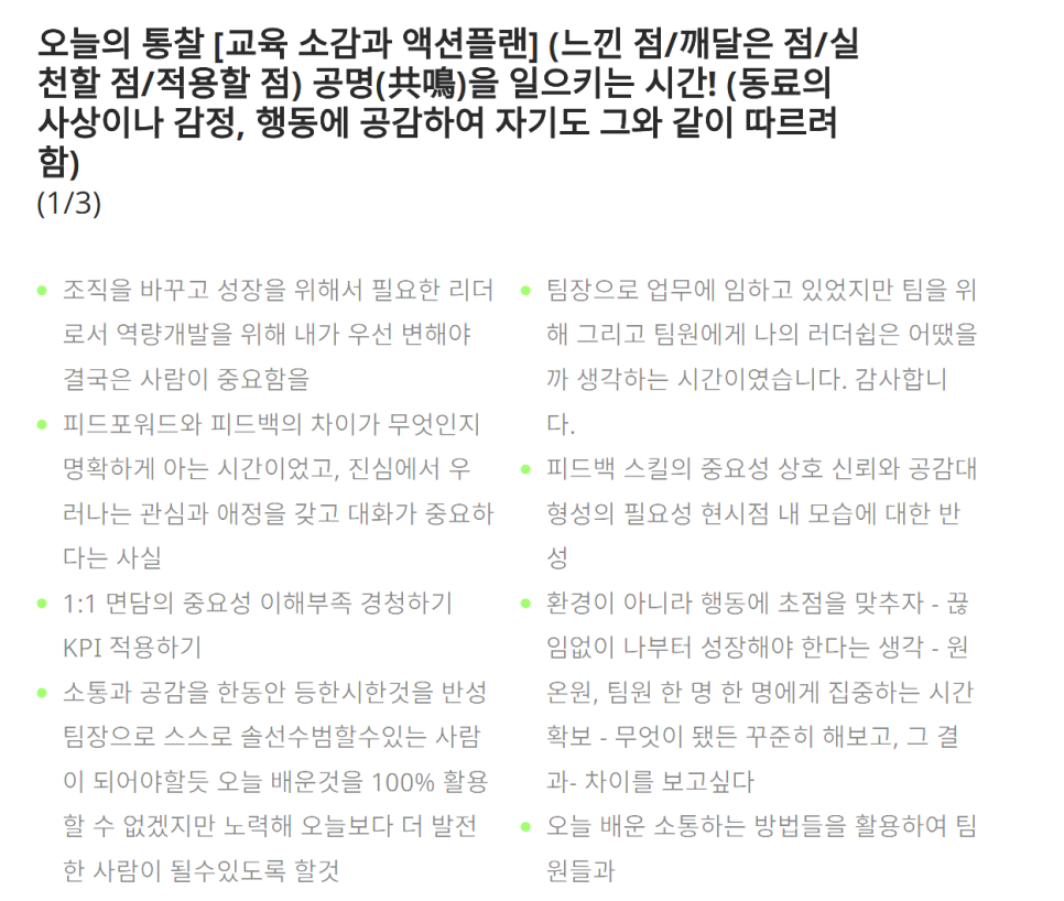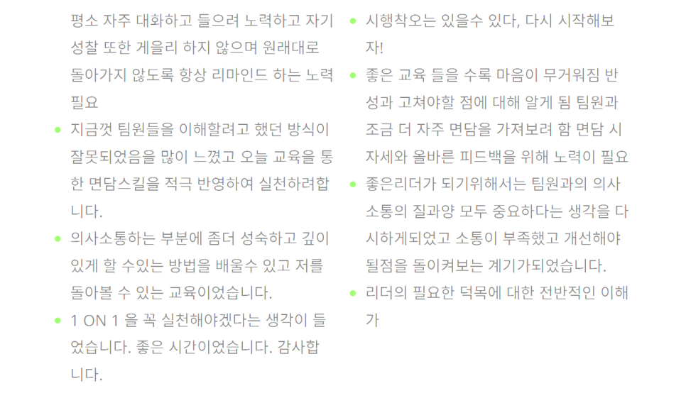 이번 교육은 정말 특별했습니다. 팀장님들의 열정과 참여도가 어느 때보다 높았고, 그 덕분에 저 또한 많은 것을 배울 수 있었습니다.