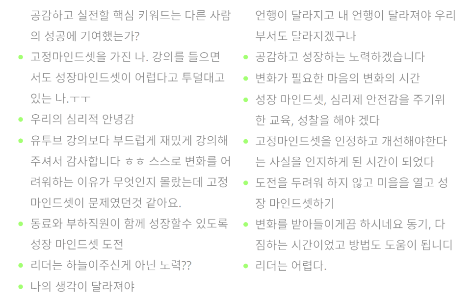 분당서울대병원 간호리더분들과 함께했던 '간호인재 육성 리더십' 특강 후기를 들려드리려고 합니다. 2시간 특강이었지만, 리더십의 핵심인 '리더의 마인드셋'에 대해 깊이 있게 나눌 수 있었던 뜻깊은 시간이었습니다.