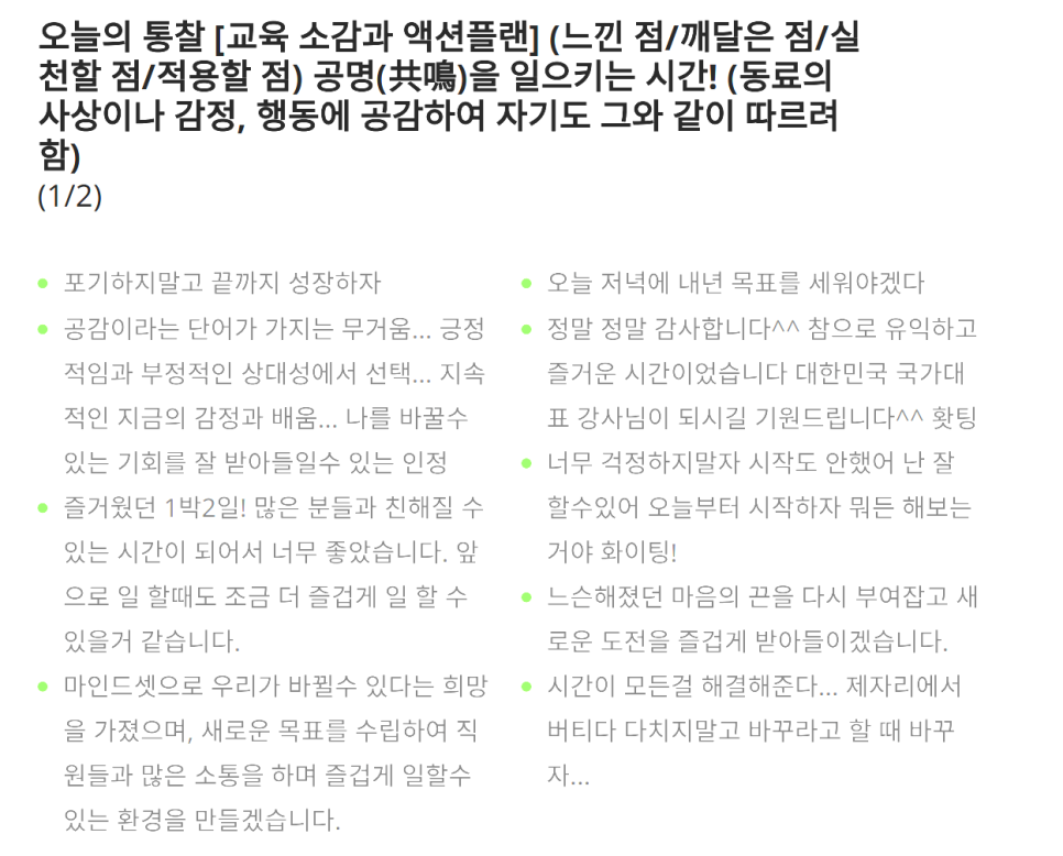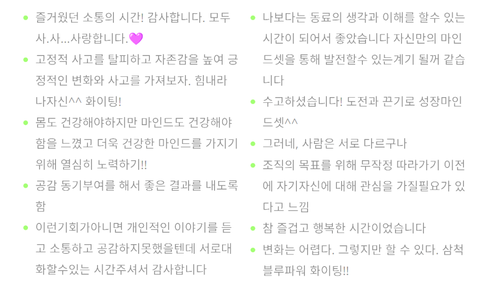 오늘의 특강은 단순한 지식 전달을 넘어 구성원들이 스스로 성장할 수 있는 동력을 발견하는 소중한 시간이었습니다. 특히 교육 담당자분께서 "임팩트 있는 내용 전달과 높은 몰입도 유지"를 언급해주신 점이 가장 기억에 남습니다. 삼척블루파워 구성원들의 열정적인 참여에 진심으로 감사드립니다.