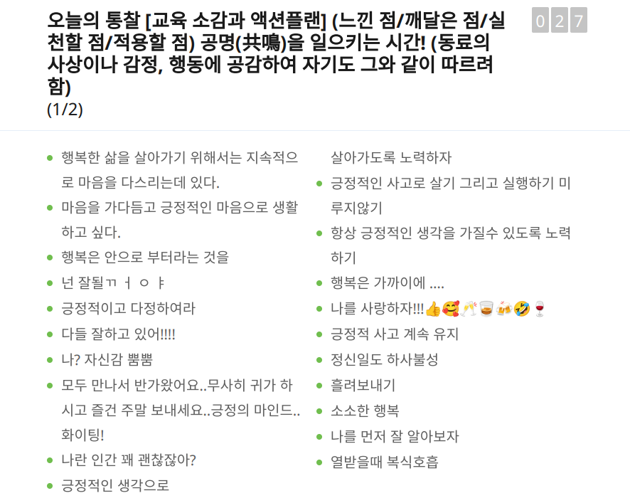 슬라이도 플랫폼을 활용한 실시간 상호작용은 교육의 몰입도를 한층 높였습니다. 참가자들은 자신만의 스트레스 해소법을 공유하고, 다른 참가자들의 경험에서 새로운 통찰을 얻었습니다. "퇴근 후 산책하기", "주말 등산", "명상하기" 등 다양한 스트레스 관리 방법이 공유되었고, 이는 모두에게 새로운 영감이 되었습니다.