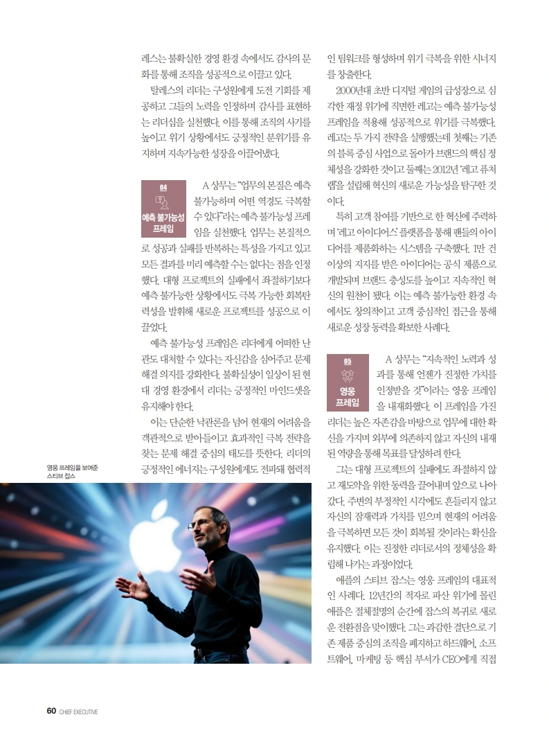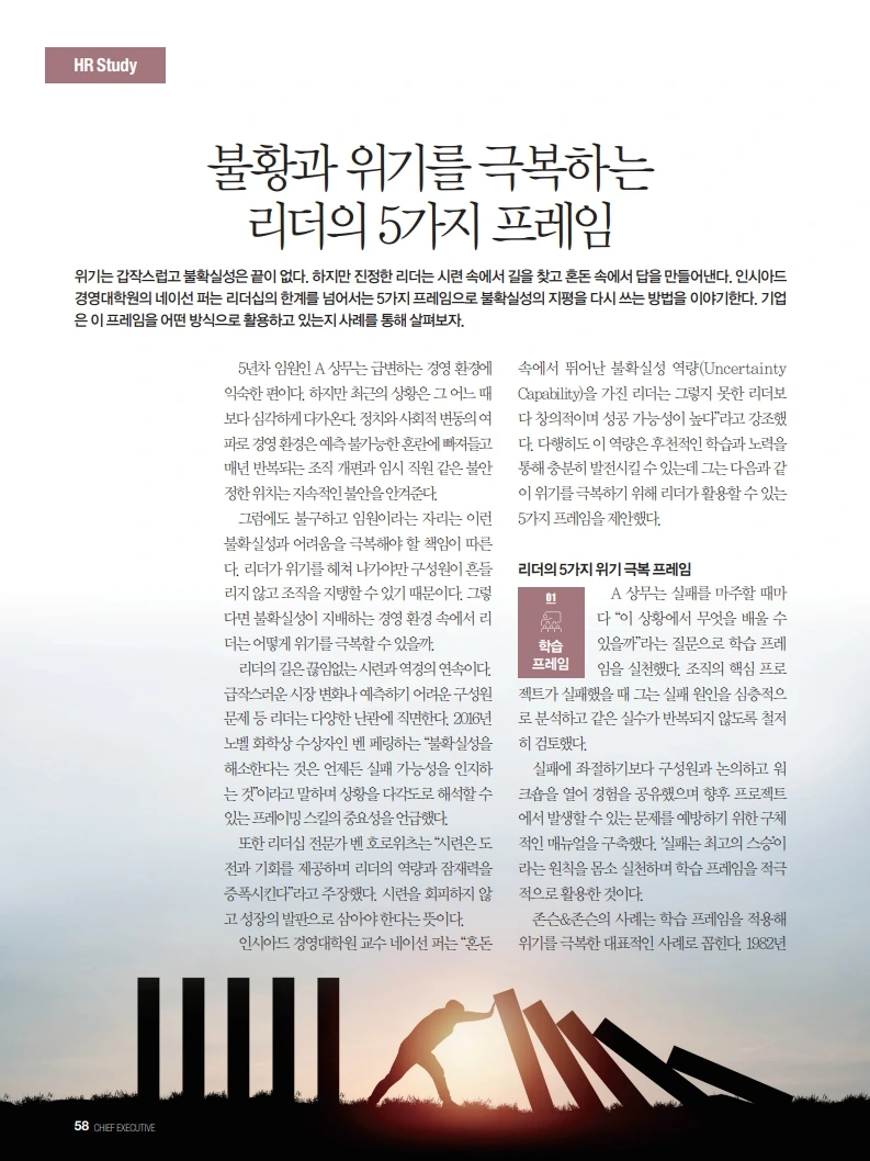 리더들을 위한 리더십전문지 치프이그젝티브(Chief Executive) 2월호에 쓴 컬럼 "불황과 위기를 극복하는 리더의 5가지 프레임"