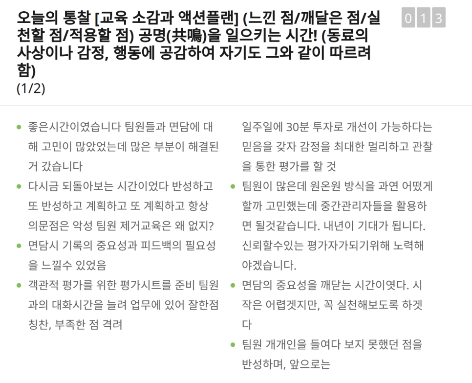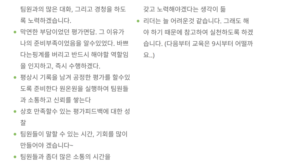 교육 후 여러분께서 주신 피드백을 통해, 이번 특강이 리더십을 발휘하는 데 필요한 실질적인 팁과 인사이트를 제공했다는 점을 확인할 수 있어 매우 기쁩니다. 특히 평가면담의 중요성과 방법, 그리고 원온원 미팅의 실행 방법에 대해 많은 도움을 받으셨다는 의견이 많아 보람을 느꼈습니다.