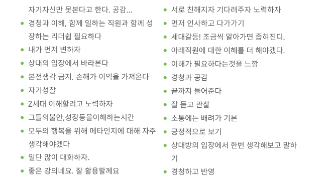 팀장님들과 함께 MZ세대와의 관계 및 소통에서 실제로 겪는 어려움에 대해 허심탄회하게 이야기를 나누는 시간을 가졌습니다. 서로의 고충을 공유하고 공감하며, 이러한 어려움을 극복하고 효과적인 소통 방안을 모색하는 데 집중했습니다. MZ세대의 8가지 특징을 다양한 강의 자료와 동영상을 통해 구체적으로 살펴보고, 팀장님들과의 열띤 토의를 통해 각자의 경험과 생각을 나누며 깊이 있는 통찰을 얻을 수 있었습니다. 선배 세대는 MZ세대를 ‘개념 없음’으로, MZ세대는 선배 세대의 행동이나 지시를 이해할 수 없다고 느끼는 인식 차이가 존재한다는 점이 확인되었습니다 . 이는 세대 간의 가치관 차이, 즉 강한 자존감, 개인주의 성향, 개인의 행복 추구, 편리함과 간편함 선호, 워라밸 중시 등 MZ세대의 특징에서 비롯되는 마찰로 볼 수 있습니다 . 실제로 많은 기업들이 MZ세대가 이전 세대와 비교했을 때 회사에 바라는 점이 다르다고 인식하고 있으며, 특히 워라밸을 가장 중요하게 생각하는 것으로 나타났습니다 . 이러한 인식 차이는 상호 간의 불신과 협력 부족으로 이어질 수 있으며, 열린 소통과 상호 이해를 통해 적극적으로 해결해야 할 부분입니다. 특히 MZ세대는 직장 생활에서 개인의 발전 가능성을 중요하게 생각하며, 회사가 이러한 성장을 지원해주지 못한다고 판단하면 퇴사를 고려하는 경향이 있습니다 . 따라서 리더들은 MZ세대의 이러한 특성을 이해하고, 단순히 지시하고 통제하기보다는 그들의 의견을 경청하고 공감하며, 명확한 목표와 피드백을 제공하고, 성장 기회를 마련해주는 노력이 필요합니다.