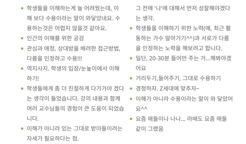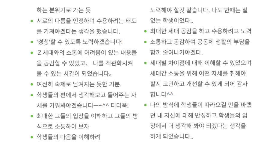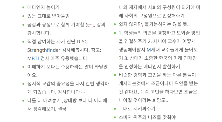 반면 많은 교수님들은 풍부한 경험과 지식을 바탕으로 '나를 따르라'는 리더십 스타일을 가지고 계셨습니다. 이 두 관점의 충돌은 학생들을 이해하지 못하게 하고, 교육 현장에서의 소통 단절로 이어질 수 있습니다.