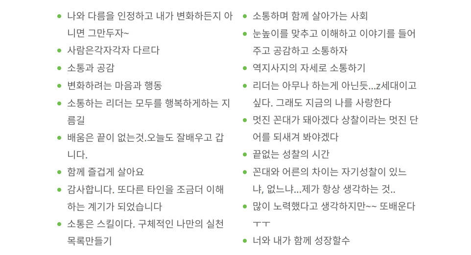 특히 사례 중심으로 진행된 강연 방식과 중간중간 진행된 토론 및 실습은 교육생들에게 깊은 인상을 남겼습니다. "시간 가는 줄 모르고 강의에 몰입했다"는 평가와 함께, 실질적인 리더십 팁들을 배울 수 있었다는 점에서 높은 만족도를 보였습니다.