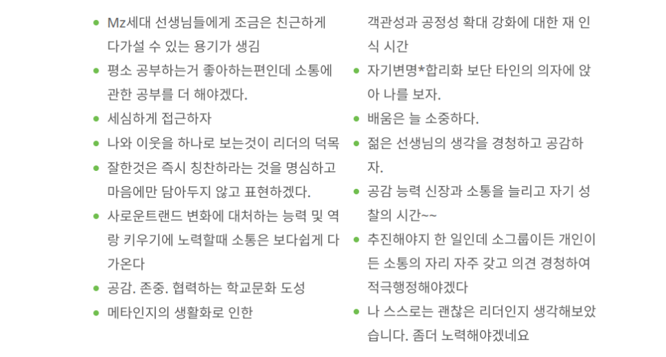 강연 후 많은 교장 선생님들께서 긍정적인 피드백을 주셨습니다. "Z세대 선생님들과 어떻게 소통하고 협력해야 할지에 대한 명확한 인사이트를 얻었다"며 감사 인사를 전하셨고, "기존에 알고 있던 내용을 리뷰하며 더 나은 리더십을 발휘해야겠다는 결심을 하게 되었다"고 말씀하신 분도 계셨습니다.