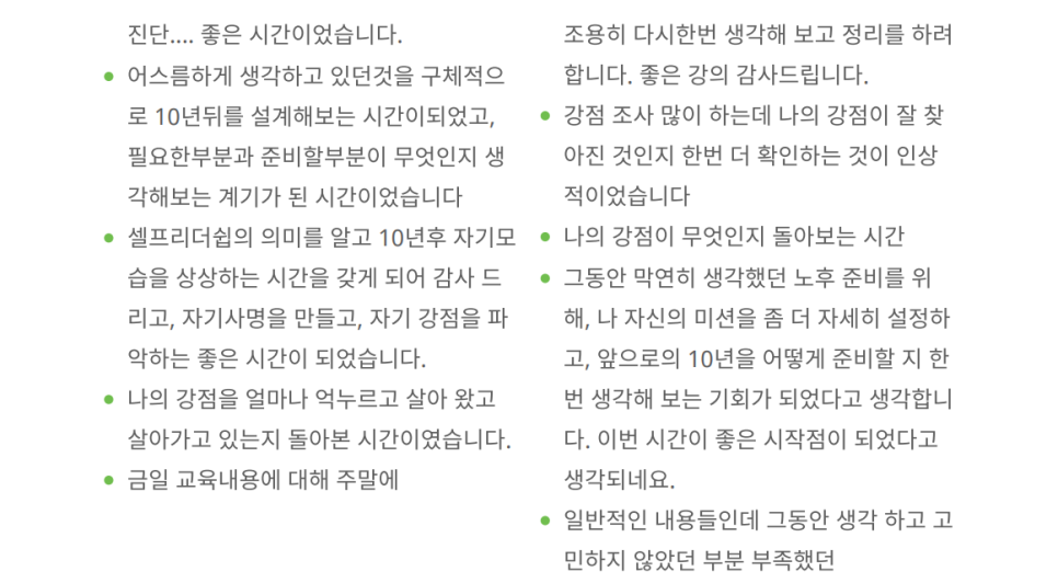 교육 후 "시간 가는 줄 모르고 몰입했다", "리더로서의 방향성을 명확히 하게 되었다"는 피드백을 들으며 강사로서 큰 보람을 느꼈습니다. 특히 "명강사라고 칭하는 이유를 알겠다"는 말씀에 책임감을 느꼈습니다.