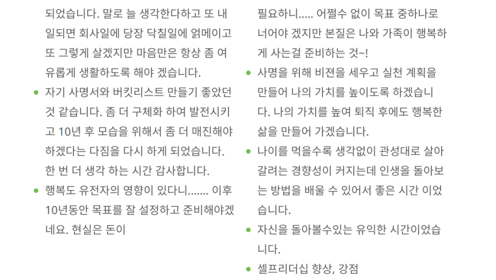 "나는 나의 강점을 활용하여 조직과 함께 성장하는 셀프 리더가 되겠습니다." "매일 아침 15분씩 명상과 자기 성찰의 시간을 갖겠습니다." "주변 동료들의 강점을 발견하고 격려하는 리더가 되겠습니다."