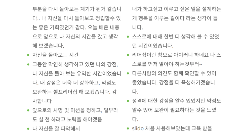 참가자분들과 함께 '셀프 리더의 특징'을 슬라이도 플랫폼을 활용해 토론했을 때, 다양한 의견이 모였습니다. 자기 성찰을 통한 깊은 자기 이해, 분명한 목표 설정, 자기 동기부여 능력, 그리고 지속적인 자기 개발과 회복력 등이 핵심 키워드로 도출되었습니다.