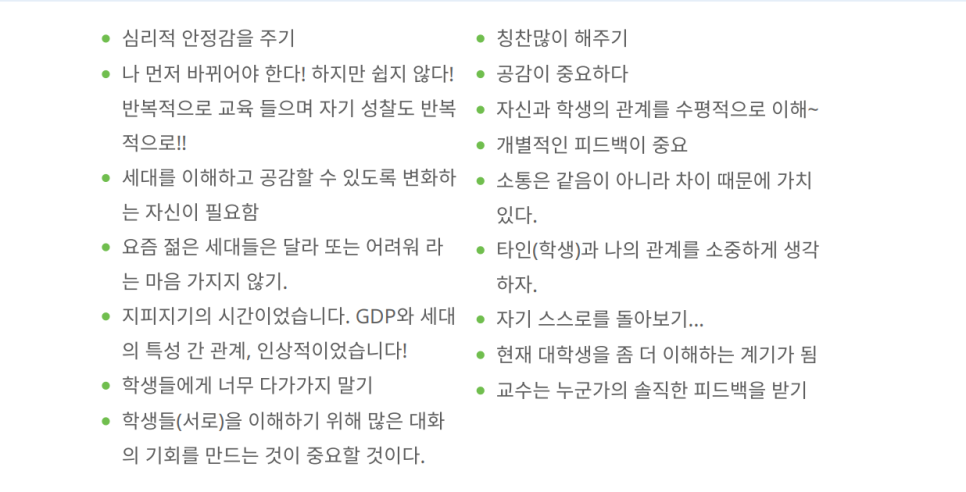 2시간이라는 짧은 시간이었지만, 교수님들의 적극적인 참여와 열린 마음 덕분에 의미 있는 시간이 되었습니다. 앞으로도 강원대학교 교수님들이 Z세대 학생들과 더 깊이 소통하고, 함께 성장하는 교육 환경을 만들어가시길 진심으로 응원합니다.