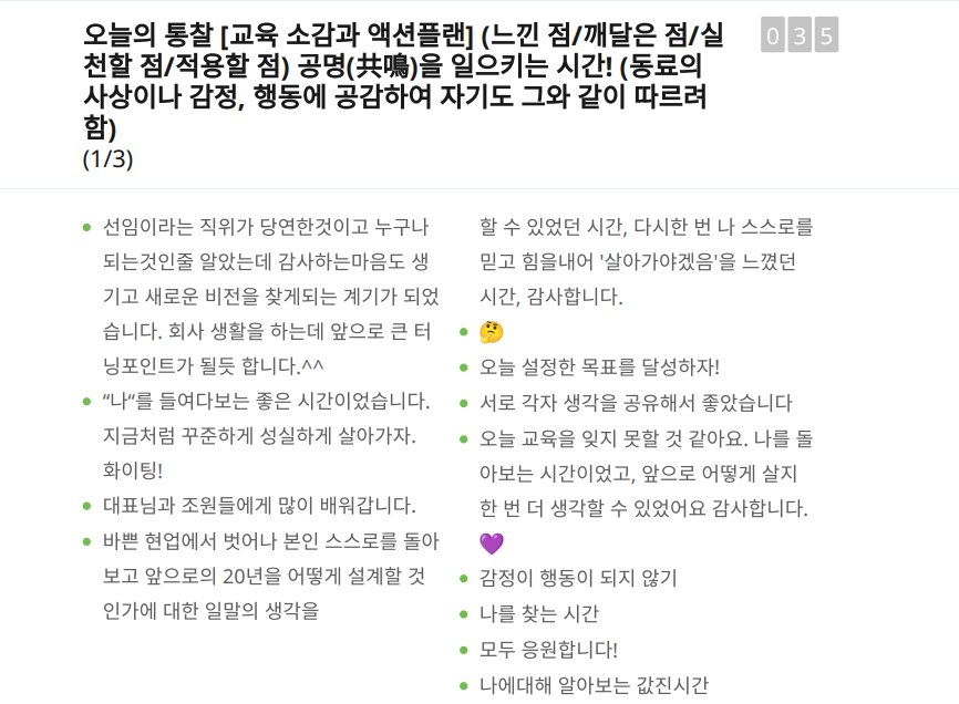 교육 후 참가자들은 "시간 가는 줄 모르고 몰입했다", "중간관리자로서 해야 할 것이 명확해졌다"는 피드백을 주셨습니다. 특히 슬라이도를 활용한 양방향 소통 방식이 교육 몰입도를 높이는 데 효과적이었다는 평가를 많이 받았습니다.