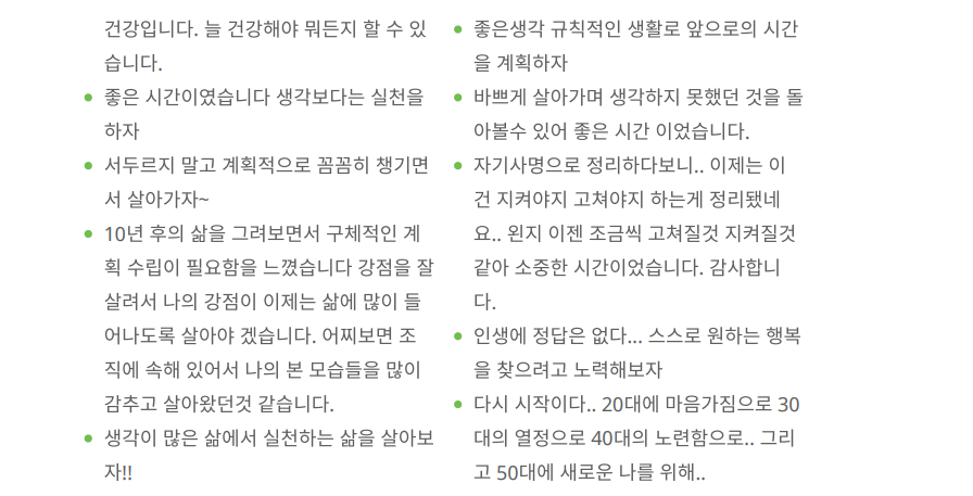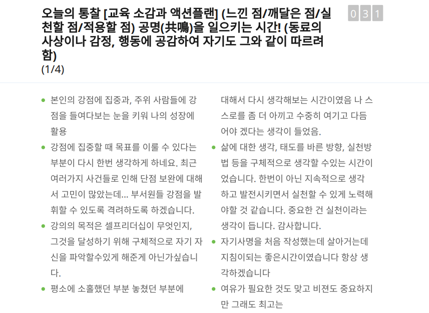 특히 인상적이었던 점은 교육 중 실습한 내용들이 당장 현업에 적용 가능한 실질적인 도구였다는 점입니다. 사명서와 비전 작성법, 강점 진단, 강점 활용 계획 등은 모두 일상 업무와 리더십에 바로 활용할 수 있는 내용들이었습니다.