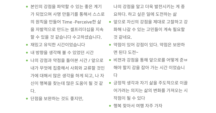 이번 교육을 통해 참여자분들은 단순히 지식을 얻는 것을 넘어, 자신의 미래와 리더십에 대한 구체적인 계획과 실천 방안을 수립할 수 있었습니다. 교육 직후 진행된 피드백에서는 "앞으로 미래에 대한 인사이트를 얻었다", "강점을 통해 미래를 설계하는 유익한 시간이었다"는 평가를 많이 받았습니다.