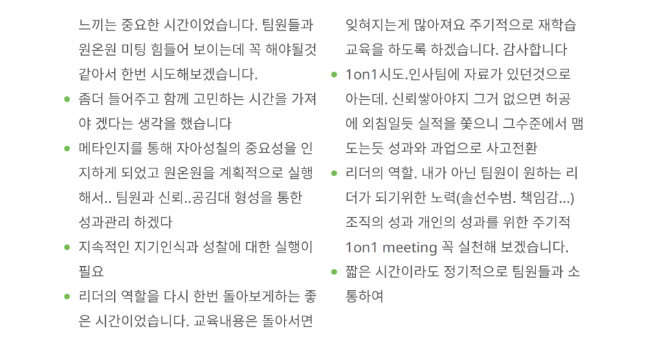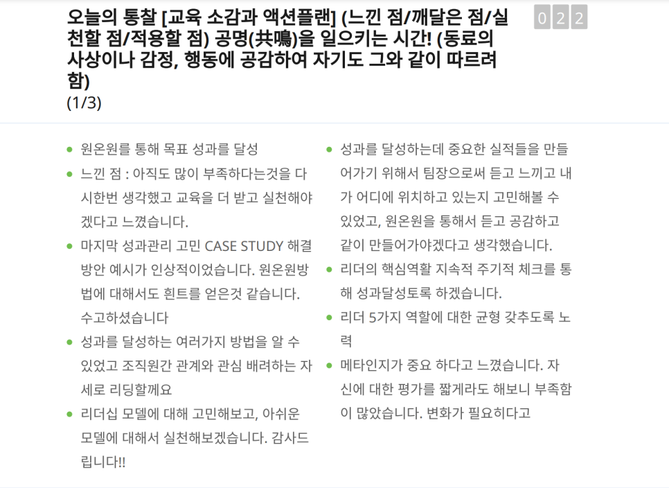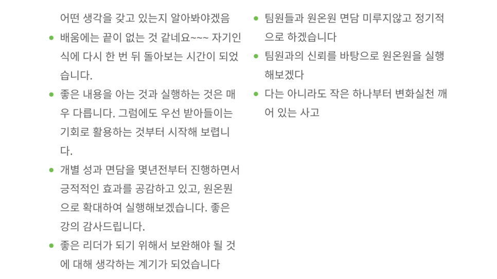 "질문이 아닌 지시로 대화를 이끌었던 나의 습관을 발견했습니다." "팀원의 말을 끝까지 듣지 않고 해결책부터 제시했던 것이 문제였음을 깨달았습니다."