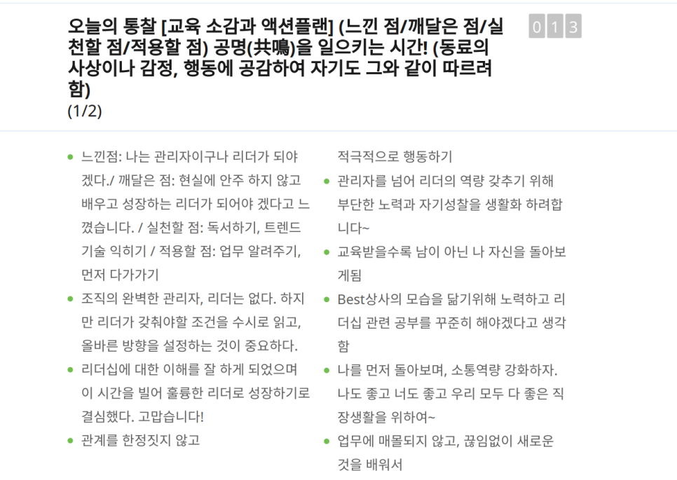 특히 '커뮤니케이션 역량'에서는 정보의 단순 전달을 넘어, 위와 아래를 원활히 소통하는 브릿지 리더로서의 역할에 초점을 맞췄습니다. 한 참가자는 "지금까지 상향식 커뮤니케이션의 중요성을 간과했던 것 같다"는 깨달음을 나누었습니다.