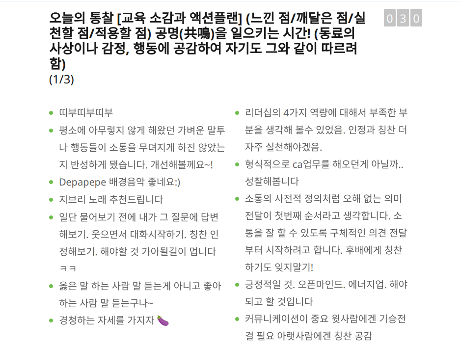 교육 후반부에서 다룬 "리더십의 본질과 통찰" 부분이 개인적으로 가장 의미 있었습니다. 좋은 리더가 된다는 것은 단순히 업무를 잘 관리하는 것을 넘어서, 사람들에게 영감을 주고 함께 성장해나가는 것이라는 메시지를 전달했습니다