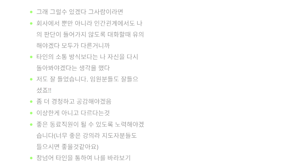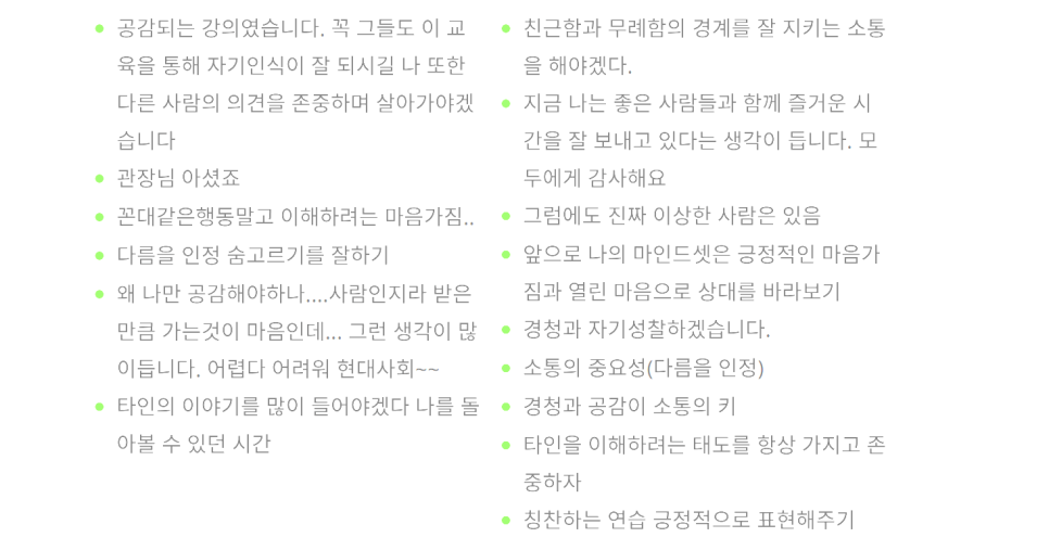 앞으로도 더 많은 조직과 구성원들이 소통의 진정한 가치를 발견하고, 서로를 이해하며 성장할 수 있는 기회를 만들어가고 싶습니다. 소통은 기술이 아닌 마음이며, 그 마음이 진정할 때 비로소 조직과 개인 모두가 성장할 수 있다는 믿음으로 계속해서 교육 현장에서 만나뵙겠습니다.